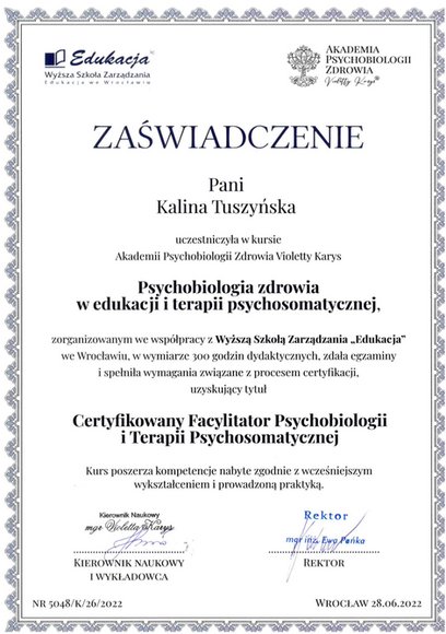 Ukończyłam 3 letnią Akademię Psychobiologii Zdrowia® Violetty Karys uzyskując tytuł Certyfikowanego Facylitatora Psychobiologii i Terapii Psychosomatycznej.